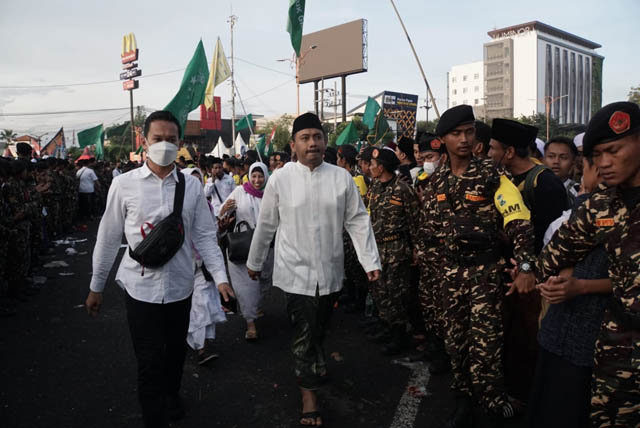Bupati Ngawi Ony Anwar Harsono ikut ngalap berkah dalam perayaan resepsi 1 abad Nahdlatul Ulama (NU) di Stadion Gelora Delta Sidoarjo. Dia mendampingi 10 ribu nahdliyin asal Ngawi.